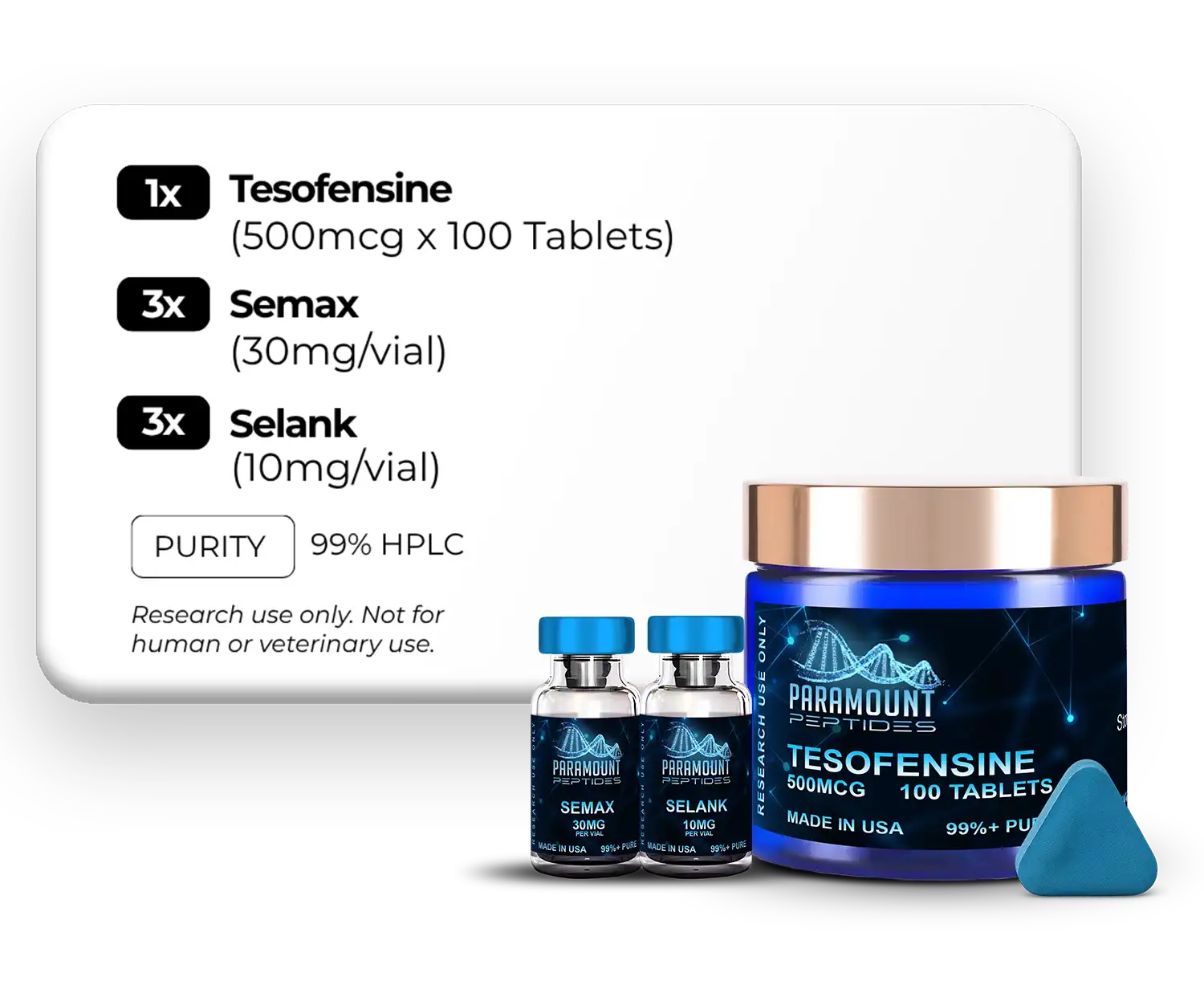 This combination enables researchers to explore the synergistic effects of monoamine reuptake inhibition (Tesofensine) alongside the neuropeptide-driven cognitive and neuroprotective mechanisms of Semax and Selank.