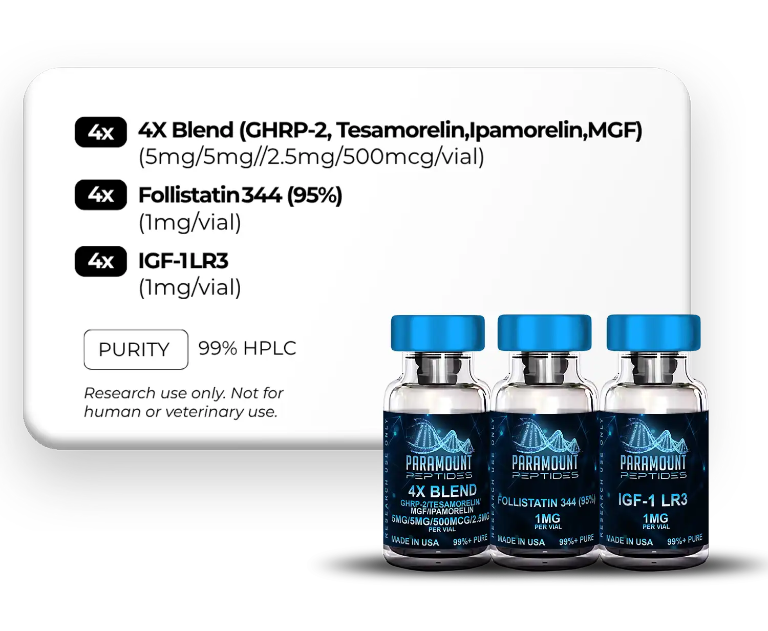 4X Blend (GHRP-2, Tesamorelin, MGF, Ipamorelin (5mg/5mg/500mcg/2.5mg)), Follistatin 344 (95%) (1mg), IGF-1 LR3 (1mg)