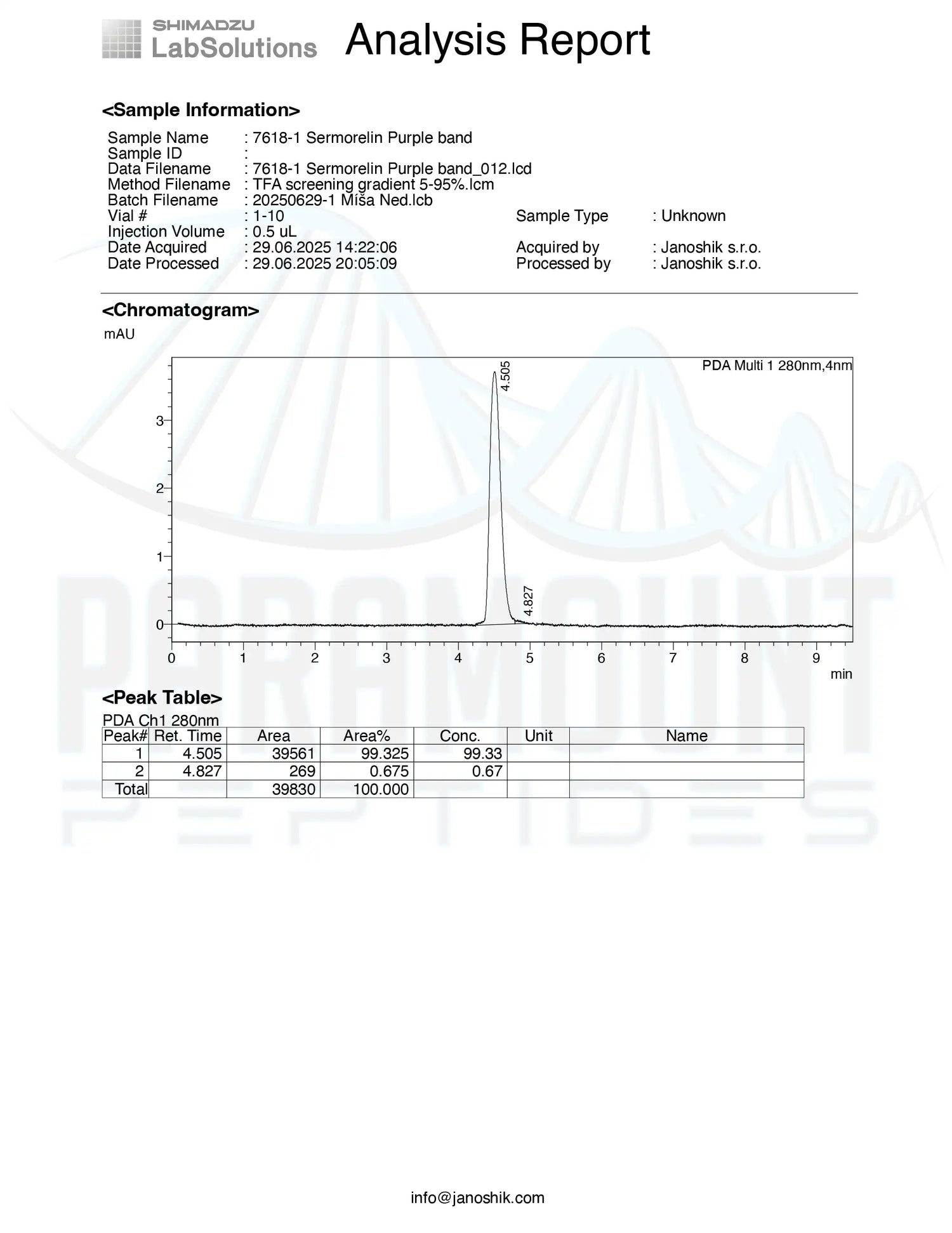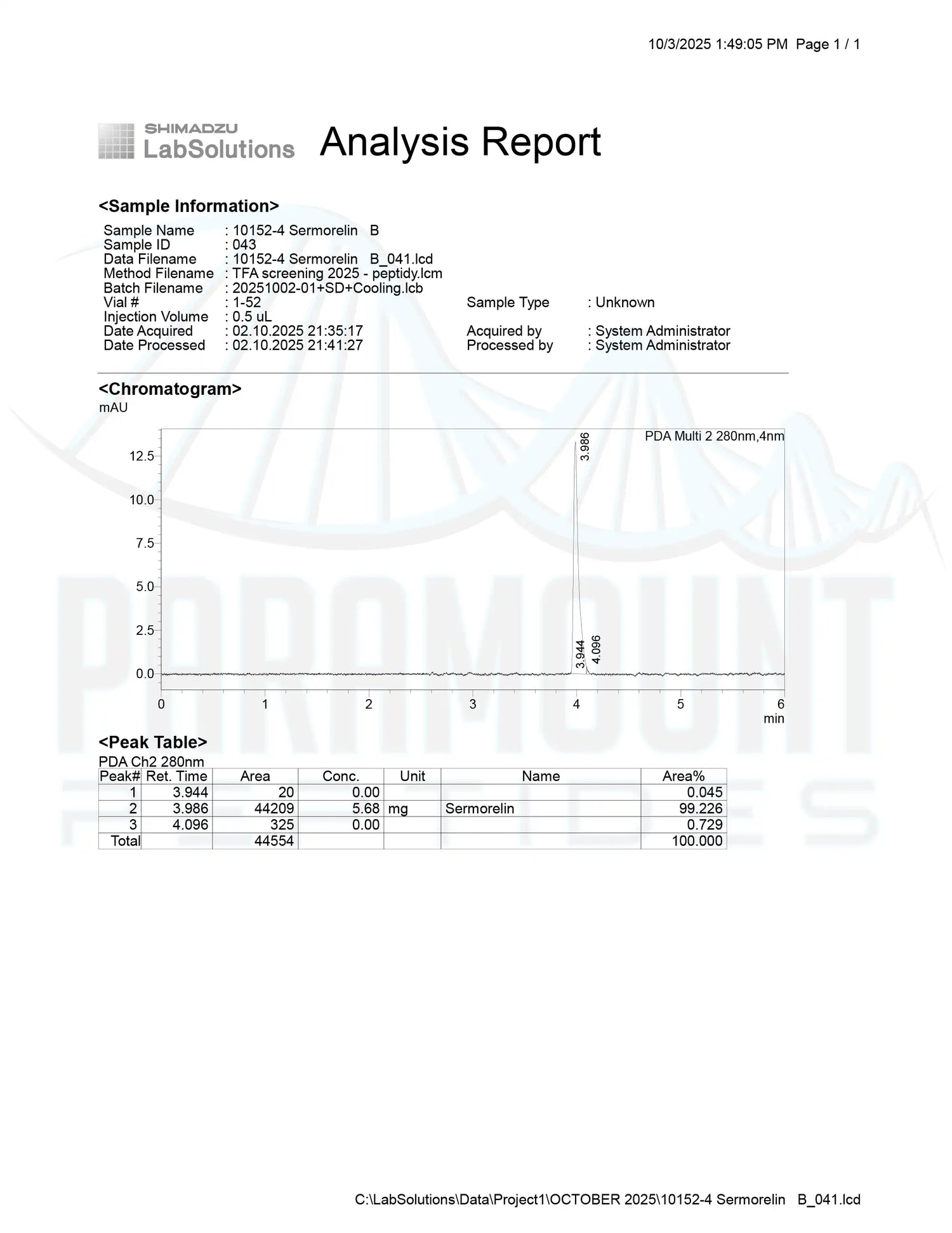 Sermorelin is a synthetic 29‑amino‑acid peptide, corresponding to the biologically active N‑terminal fragment (1–29) of human growth hormone–releasing hormone (GHRH). It acts as a GHRH receptor agonist, triggering endogenous growth hormone release in research settings and serving as a valuable tool for studying GH-axis regulation, pituitary feedback loops, and neuroendocrine signaling.