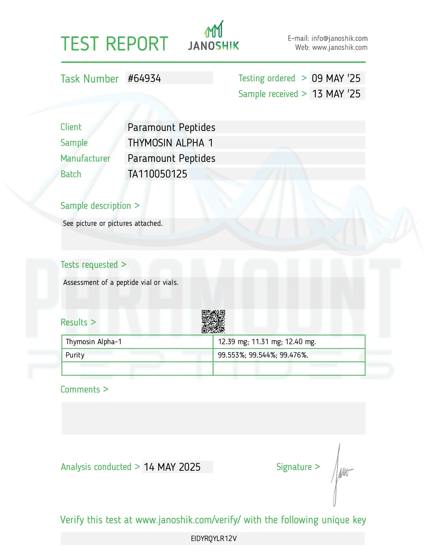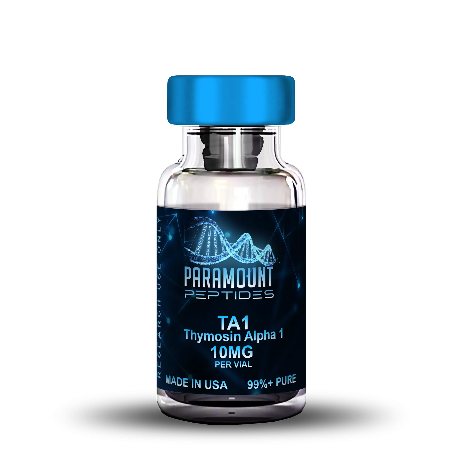 Thymosin Alpha 1 (TA1) is a synthetic, acetylated 28–amino-acid peptide derived from the N‑terminus of prothymosin alpha. It is produced by thymic epithelial cells and functions as a potent immunomodulatory peptide in laboratory research. TA1 interacts with innate immune cells—such as dendritic cells, macrophages, and natural killer cells—through Toll‑like receptors (TLR 2 and TLR 9), leading to immune activation and regulation.