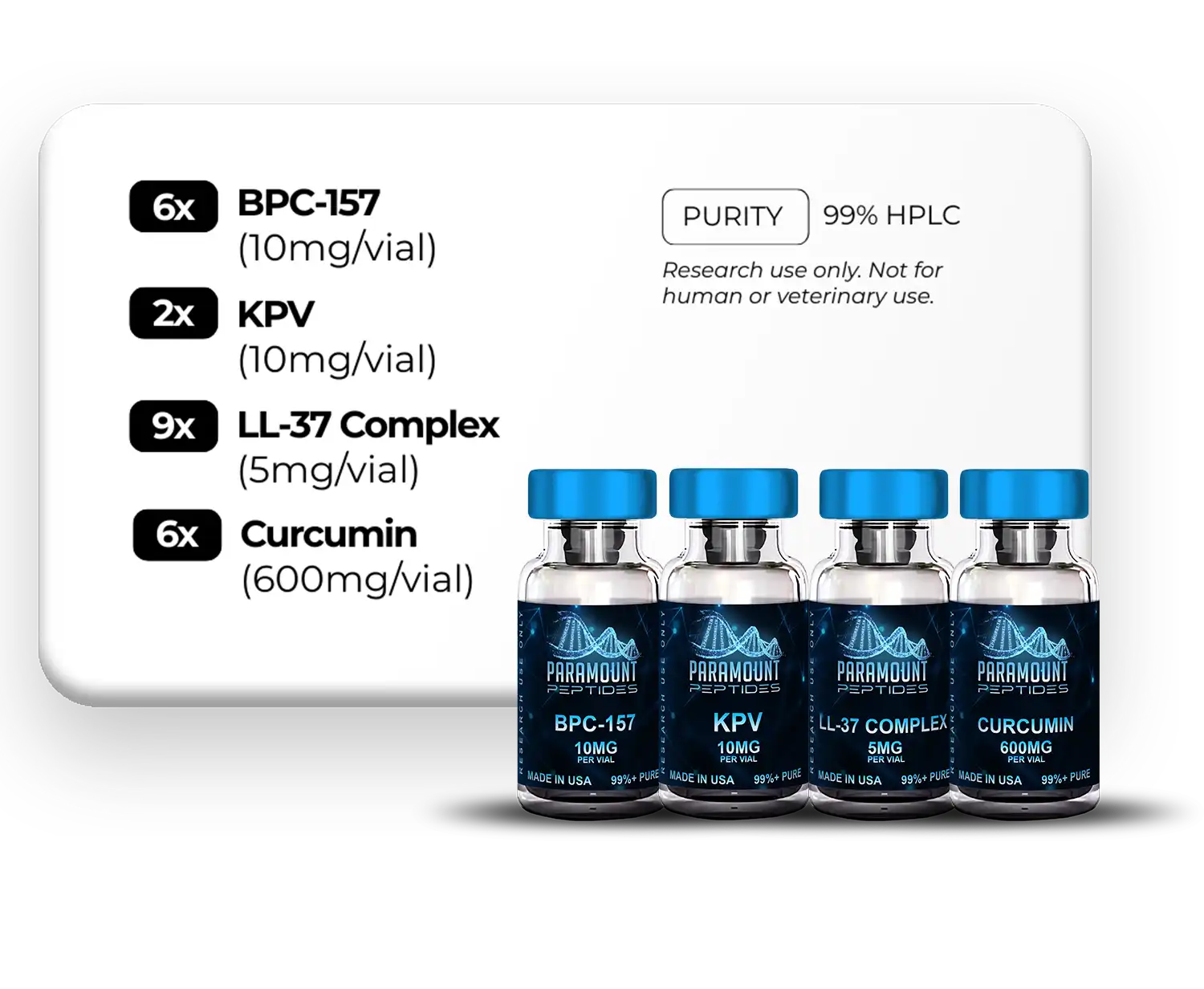 Together, these components enable multifaceted preclinical investigations into gut barrier restoration, microbial balance, tissue resilience, and systemic inflammation modulation. This bundle is intended for laboratory research purposes only.